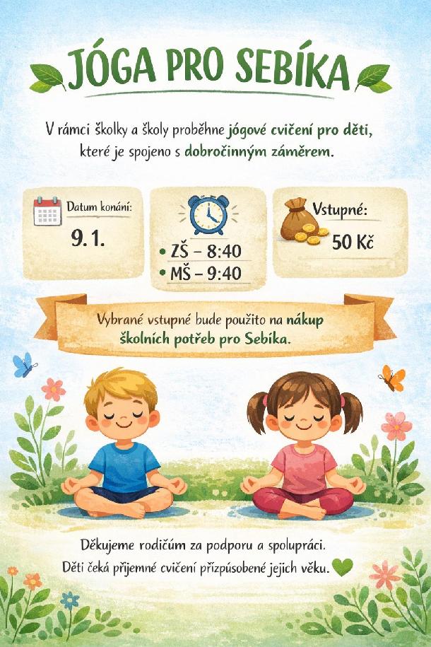 V rámci školky a školy proběhne jógové cvičení pro děti, které je spojeno s dobročinným záměrem.