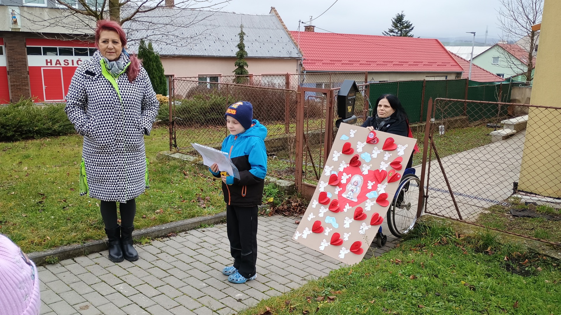 Děti po celý rok jsou v kontaktu s dlouhodobě nemocným Sebíkem Vráblíkem. Průběžně mu psaly vzkazy, obrázky, občas mu zamávaly, když přišel na zahradu. Včera 16.12.2025 jsme mu předali andílkové přání v podobě srdcí s přáním a obrázkem od každého dítěte i paní učitelek. Předali jsme mu také poukaz na zdravotní školní batoh, který mu zakoupíme ze vstupného akce Jóga pro Sebíka. Děti mu zazpívaly a popřály k vánočním svátkům, ale i k uzdraven a k opětovnému nástupu do školky. Maminka Sebíka byla velmi dojatá a Sebík byl moc šťastný, že se děti na něho těší a že je nadále součástí kolektivu.